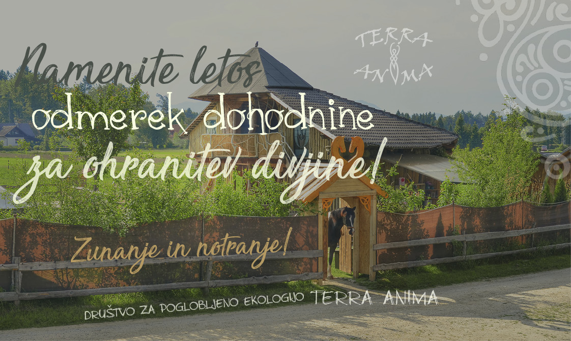 Namenite letos ODMEREK DOHODNINE za ohranitev divjine! Z vašim 1% od dohodnine se bomo še naprej trudile za ohranjanje zunanje in notranje divjine. S tem podprete: -ekologijo divje duše -žensko moč, ki gradi ljubeč svet -naravovarstveni artivizem -razvoj zgodb, ki budijo svetost narave Namenitev je hitra in enostavna: Elektronsko prek portala eDavki. kjer je treba poiskati vlogo Zahteva za namenitev dela dohodnine za donacije (Doh-Don). V vlogi je treba vpisati naziv organizacije Terra Anima in njeno davčno številko (54135451). ali pa natisnite in izpolnite tale OBRAZEC, ter ga po pošti pošljite na vam najbližjo izpostavo FURS-a.